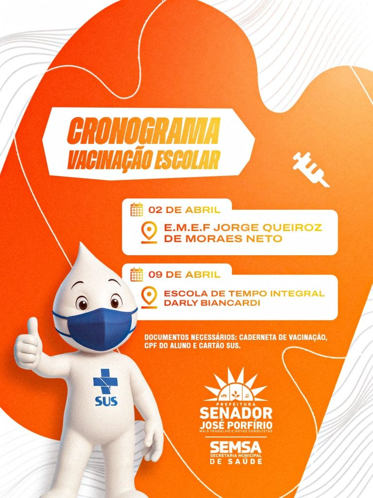 A Prefeitura de Senador José Porfírio, por meio da Secretaria Municipal de Saúde (SEMSA), segue com o cronograma de vacinação escolar.